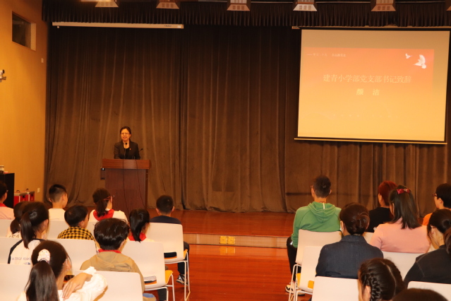 颜洁对宣讲团一行的到来表示热烈欢迎,并介绍了建青小学部的基本情况,并希望小学部全体师生能够不忘初心、虚心学习,通过“领雁先锋”进校园的辐射带动作用,在建青这片沃土上孵化出更多的优秀队员、雏鹰中队、雏鹰大队,努力实现立德树人的根本目标。