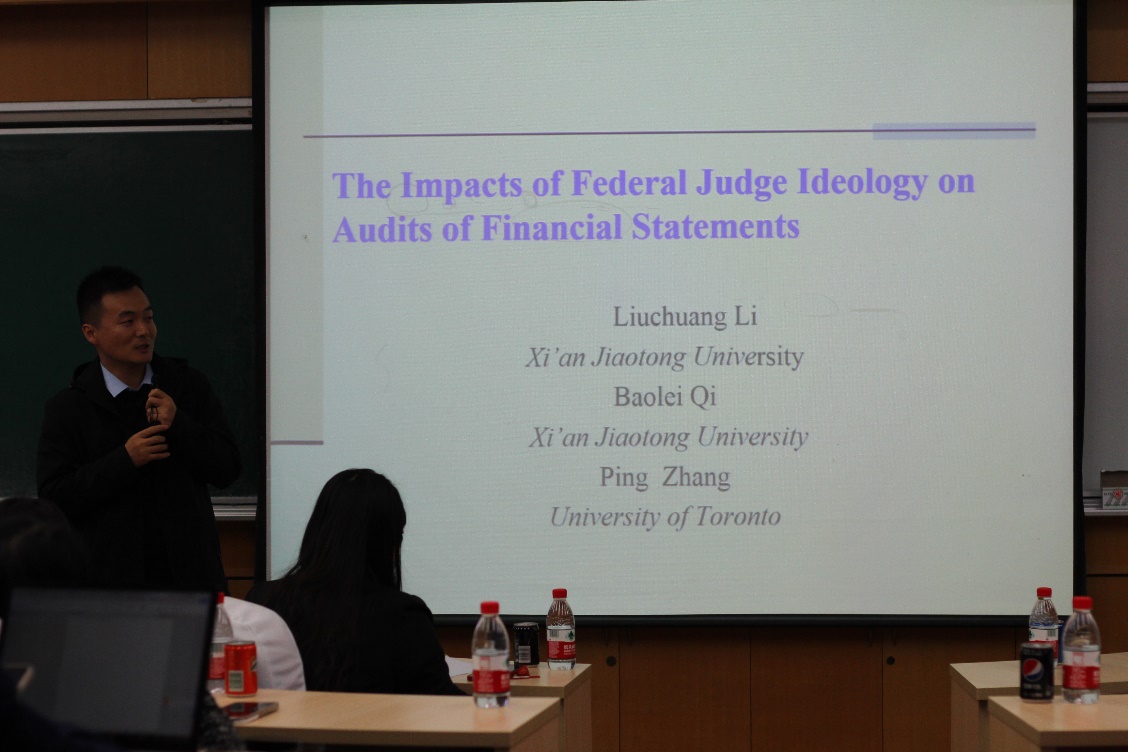 齐保垒教授首先发表了题为“区域执法能力差异对审计行为的影响研究”的主题报告,分享了团队如何用实证研究考察了美国联邦法官的构成对审计行为的影响。齐教授的精彩分享让在座师生对国际化视野下的审计师行为产生了极大兴趣,并踊跃就此进行提问与齐教授交流。