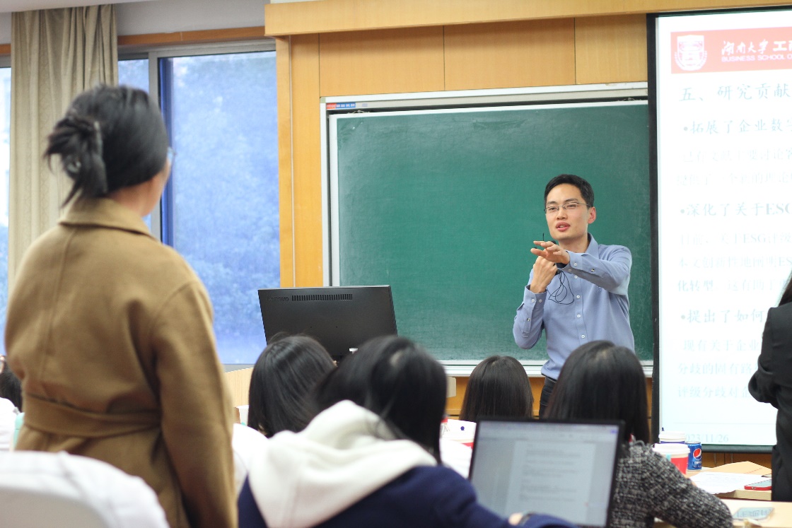 曹丰副教授在主题为“ESG评级分歧、组织合法性与企业数字化转型”的报告中,阐述了ESG评级分歧度对企业数字化转型的影响,并且深入浅出地分享了如何更好地立足于业界实践开展学术研究。同学们也围绕着ESG评级和企业数字化转型两大热点话题积极提问,现场气氛热烈。