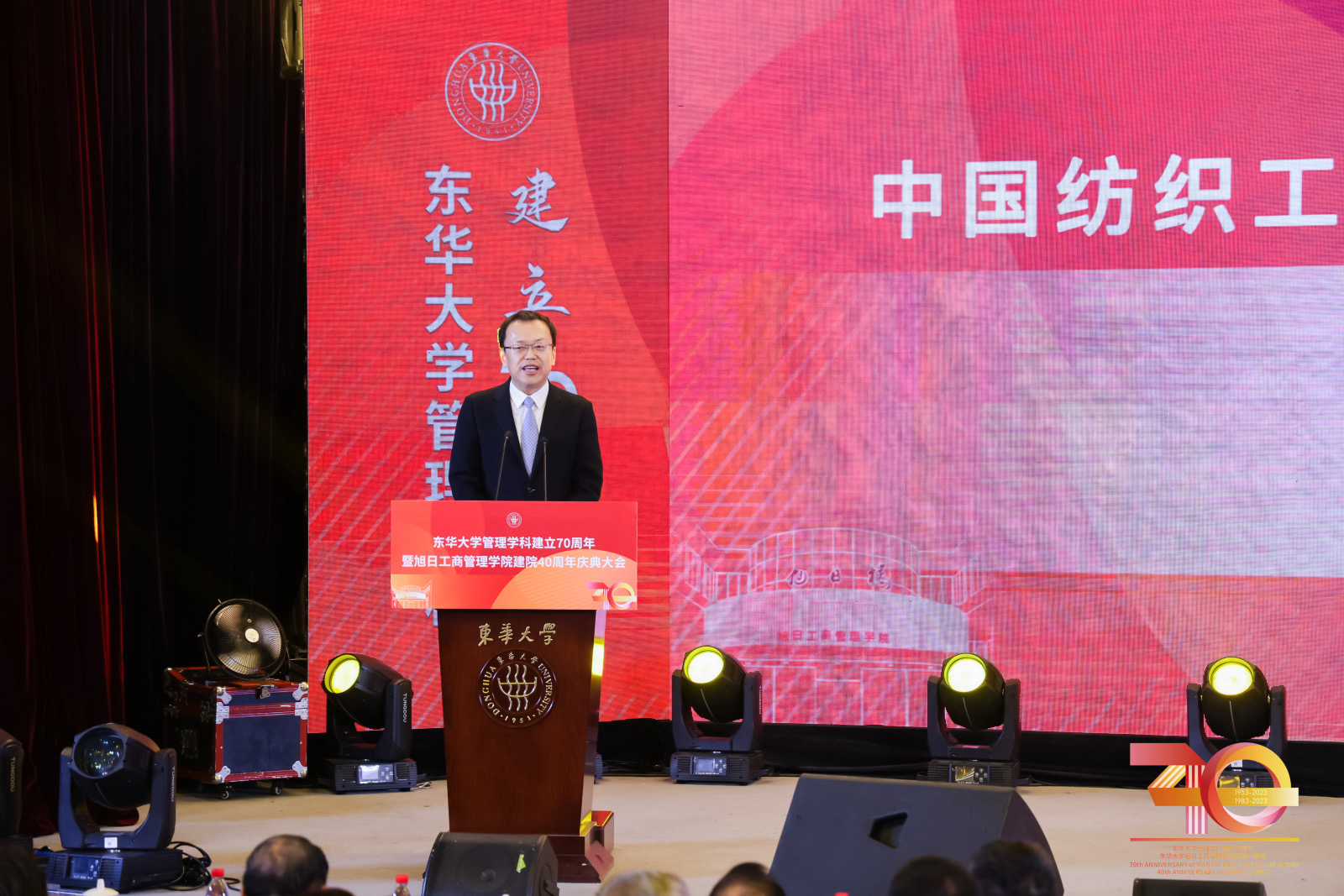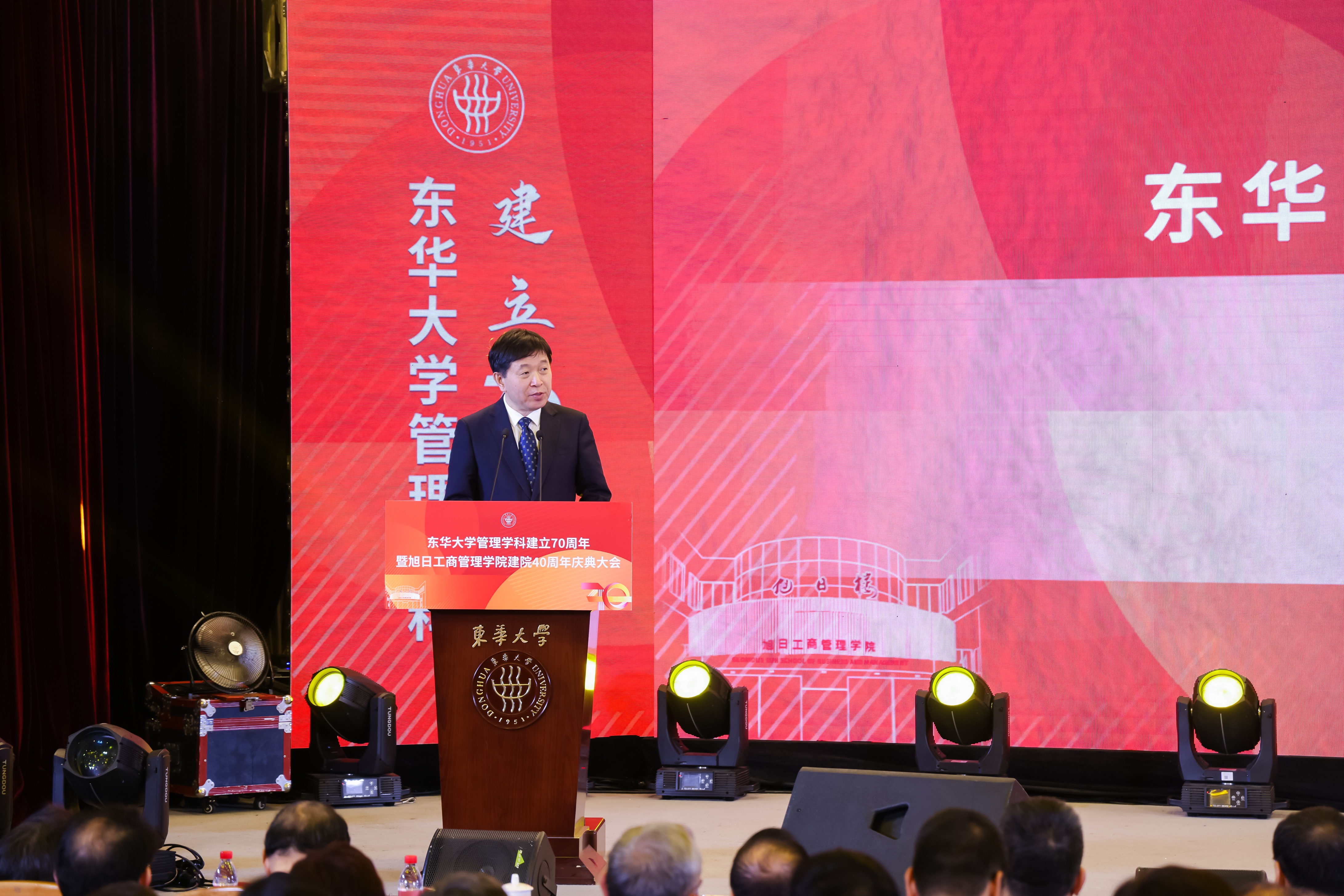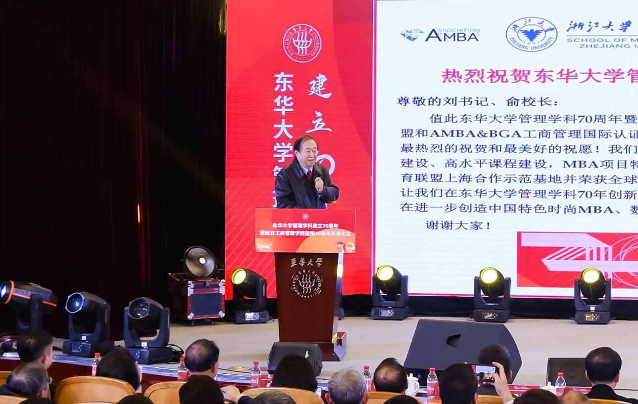 中国纺织工业联合会副会长李陵申,上海市人民政府参事顾晓敏,东方国际集团党委副书记、总裁季胜君,旭日集团副董事长、总经理杨勋,浙江大学文科资深教授、AMBA中国代表王重鸣等校外嘉宾,以及我校党委书记刘承功、校长俞建勇,副书记李成龙,副校长陈革、阎林平,原校领导徐明稚、吴楚武、浦解明、刘春红等出席大会。学校相关部门学院和兄弟高校相关学院负责人,bwin·必赢唯一官网历任领导班子、退休教师、师生和校友代表与会。大会由阎林平主持。