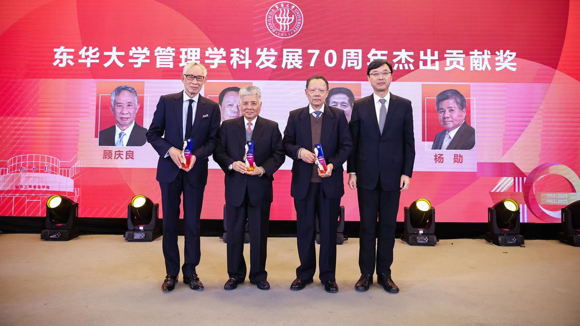 大会颁发bwin中国官方网站管理学科发展70周年杰出贡献奖,刘承功为获奖者颁奖。bwin·必赢唯一官网第一任党总支书记吴楚武、原院长孙俊康、常务副院长顾庆良和杨勋获奖。