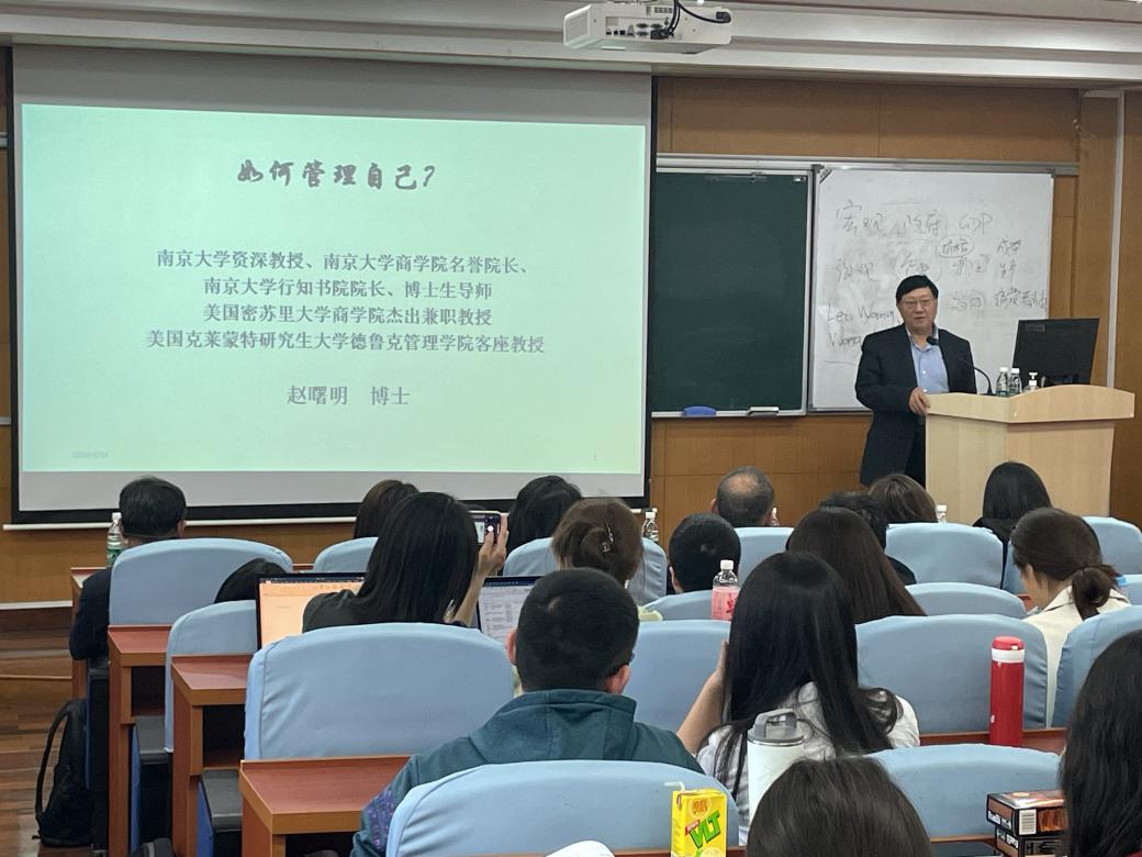 4月24日下午3:00,学院邀请到南京大学商学院名誉院长、南京大学文科资深教授赵曙明作题为“如何管理自己”的学术报告。本次报告由bwin·必赢唯一官网副院长杨帅教授主持,学院党政班子成员、专业教师、硕、博研究生齐聚一堂,共同聆听了赵教授的分享。