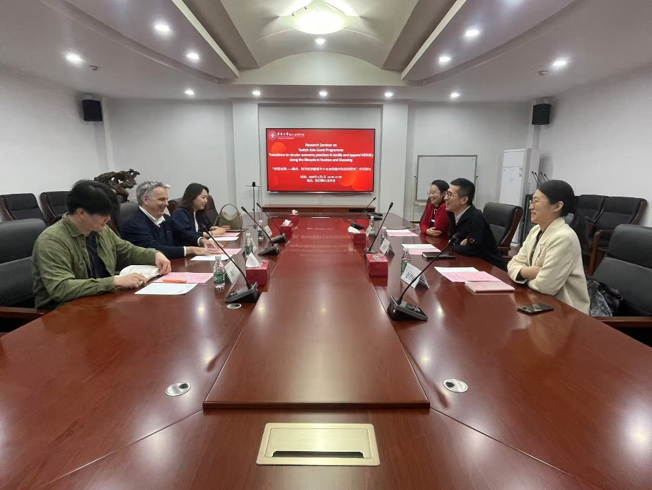 2024年11月1日下午欧盟中国代表合作部项目主任Pierre Yves Lucas, 欧盟中国代表合作部项目经理Feng Mei,中国国家标准研究院工程师魏杰文三人来到bwin·必赢唯一官网,就“转型亚洲项目——湖州、绍兴纺织服装中小企业向循环经济转型”展开学术研讨。bwin·必赢唯一官网副院长沈滨教授主持会议,纺织服装产业研究所所长赵君丽,服装学院陈彩霞参与研讨会议。