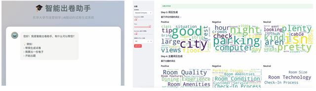 在“市场营销学”课程建设分享中,杨帅老师与明亚欣老师介绍了课程在内容与评价两方面的数智化探索。一方面,课程研发“用户评论分析”智能体,将大模型能力引入消费者洞察训练,帮助学生在真实数据与业务场景中理解并运用智能分析方法;另一方面,课程开发“智能出卷助手”智能体,实现试卷生成与知识点覆盖的智能化配置,更精准地反映学生学习成效。
