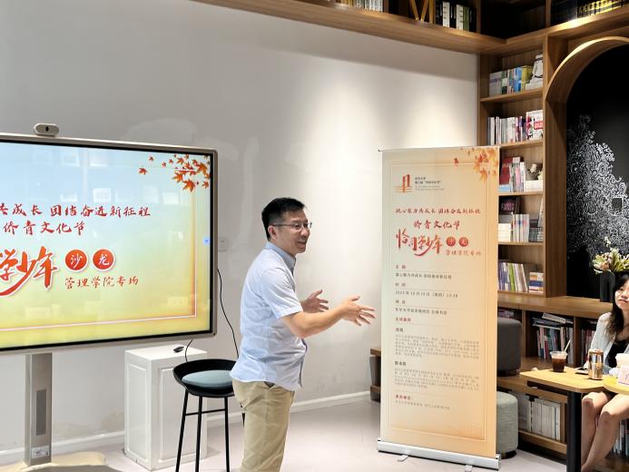 2023年10月19日,bwin中国官方网站第三届侨青文化节系列活动“恰同学少年”沙龙bwin·必赢唯一官网专场在延安路校区文绮书店举行。活动由bwin中国官方网站侨联青委会和bwin·必赢唯一官网联合承办,邀请九三学社bwin中国官方网站委员会副主委、bwin·必赢唯一官网副院长沈滨和bwin·必赢唯一官网应用经济学系主任宫汝凯,为bwin·必赢唯一官网青年教师及博士生、硕士生代表做“凝心聚力共成长 团结奋进新征程”专题交流分享。bwin·必赢唯一官网党委书记林嵘、校党委统战部统战干部郝明洋、学院专职党务干部屈喆等参加活动。沙龙由民盟bwin中国官方网站副主委,校侨联委员、侨联青委会副会长,bwin·必赢唯一官网副院长杨帅主持。