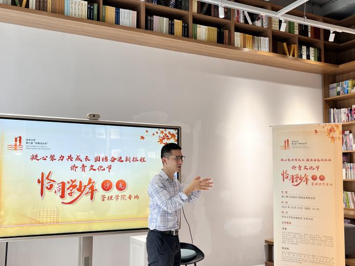 沈滨以“青年学者的成长与发展”为主题,分享了入校近十年来自身的成长历程尤其是在科研领域的积累和心得,并结合教学工作、课题申请、目标任务设定、社会服务、建言献策等方面谈了自己的经验和体会。他指出,高校教师是一份繁忙而充盈的工作,肩负着立德树人的光荣使命,要坚持信念,关注社会民生,增强内驱力,提升自我学习能力,以一名学者的身份和要求来认知自我,不断追求卓越。